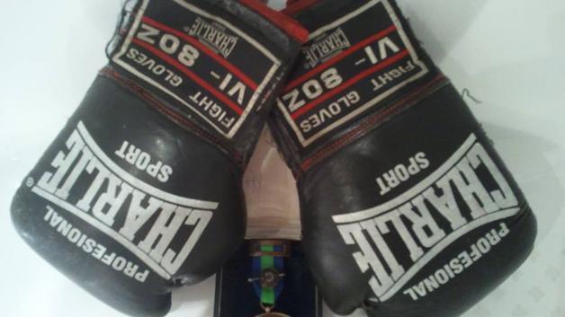 Para comenzar entran en el sorteo dos cosas mías: la primera es la medalla que me concedieron al mérito deportivo; la segunda son los guantes con los que realicé mi primer combate como profesional.